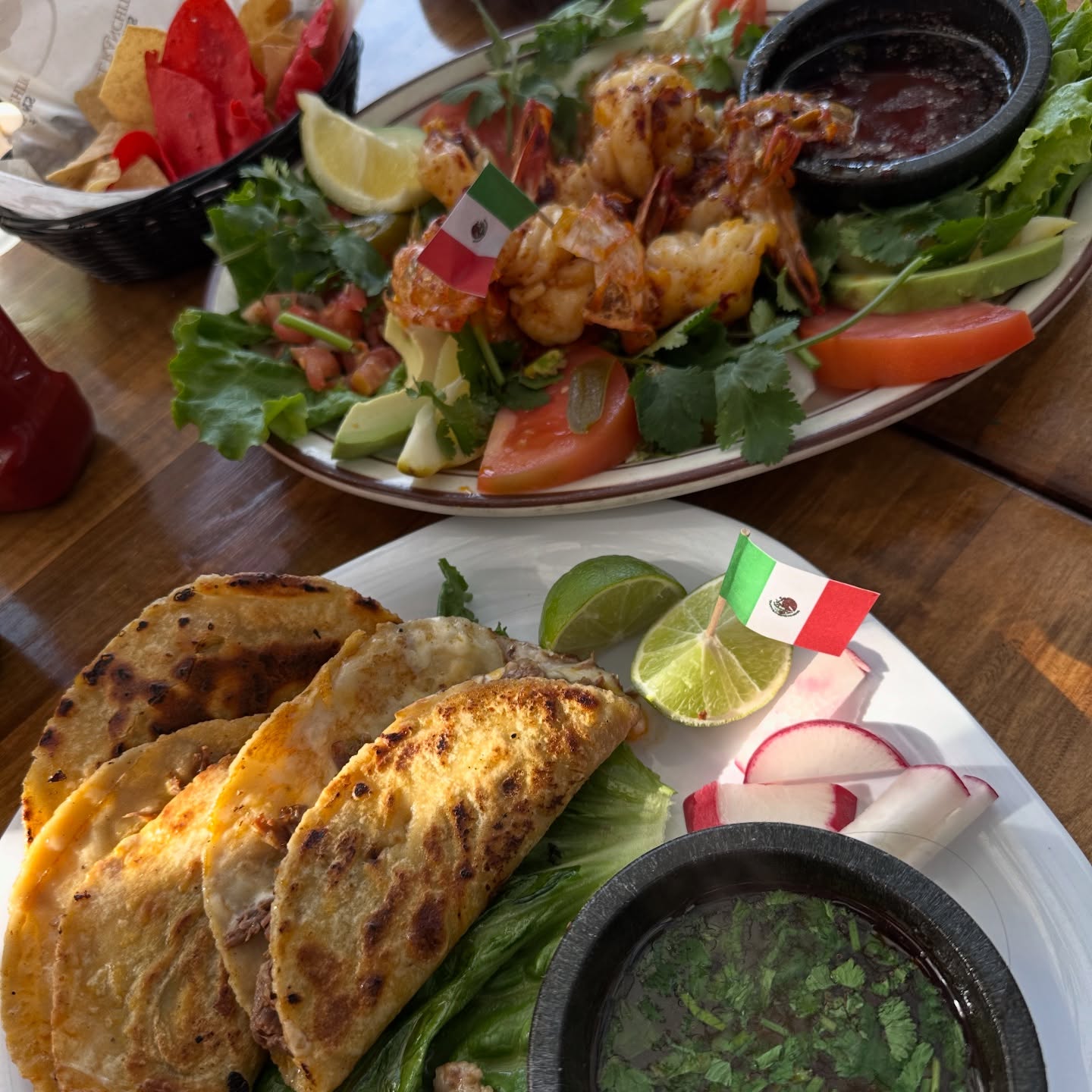 Chopped Carne Asada and Mazatlan shrimp, mixed, and sauteed in Mojo de Ajo butter. Topped with pico de gallo and cheese on corn tortillas. Served with black beans & rice